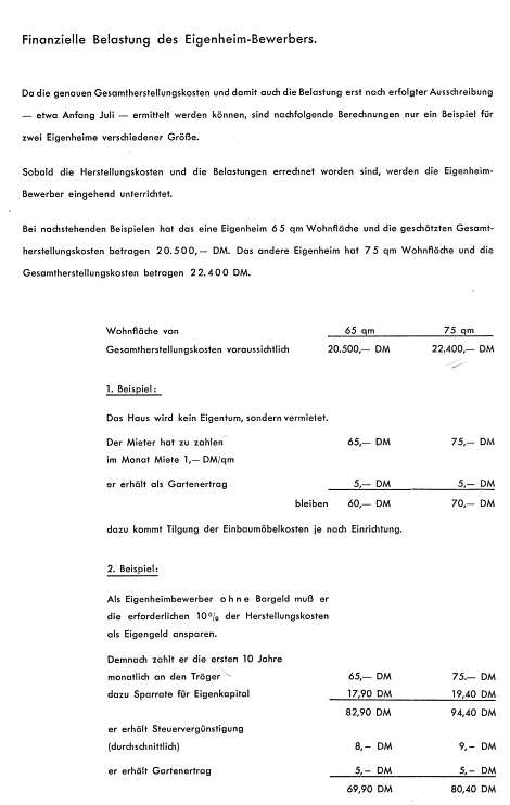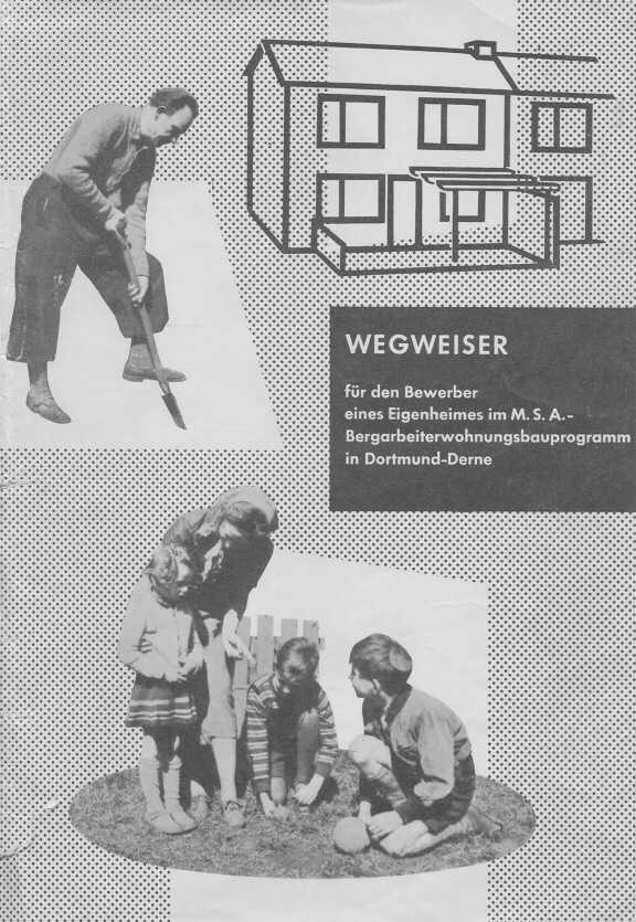 Im sozialen Wohnungsbau ist heute meistens der Wohnungs-Anwärtsr oder Eigenheim-Bewerber dem Architekten sowie dem Bauträger unbekannt. Ein persönlicher Kontakt besteht nicht. Dieser Prospekt und die Ausstellung in Dortmund-Derne sollen dazu dienen, um einen solchen Kontakt herzustellen, also um auch die Meinung des Kunden zu hören. Wer einen Anzug kauft, probiert ihn vorher an. Die Ausstellung ist sozusagen die Anprobe. Der Eigenheim-Bewerber muß sich darüber klar werden, welcher Haustyp ihm am besten paßt, räumlich sowohl als auch finanziell. Da dies nicht alles an einem Tag geschehen kann, bleibt die Ausstellung etwa 3 Monate geöffnet. Es werden außerdem Führungen vonseiten der Architekten und des Bauträgers veranstaltet, damit über alle Fragen eingehend Auskunft erteilt werden kann.
